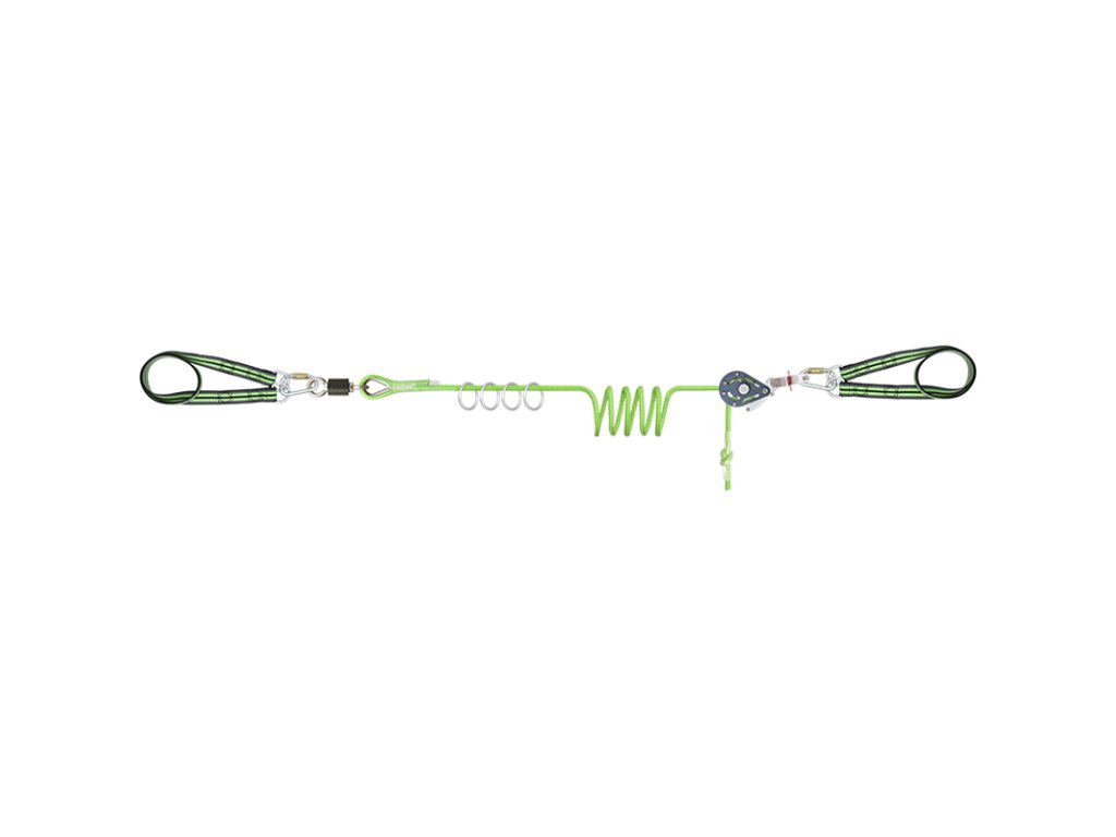 - kernmantlové lano (průměr 16 mm) je vybaveno speciálně navrženým napínákem, který umožňuje napnutí lana mezi dvěma opěrnými body