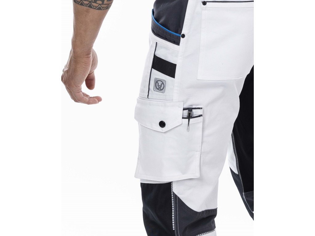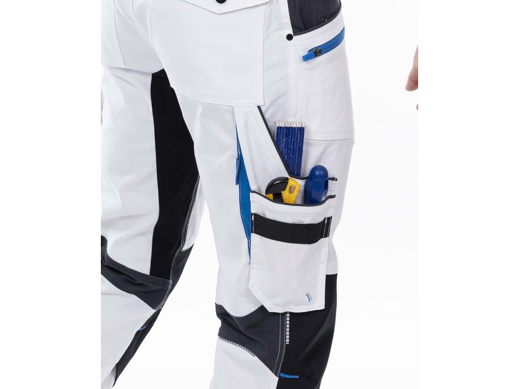 - na pravé nohavici je umístěna multifunkční kapsa na skládací metr, šroubovák a odlamovací nůž s širokými poutky, na levé nohavici je velká dvojitá kapsa krytá patkou na druk