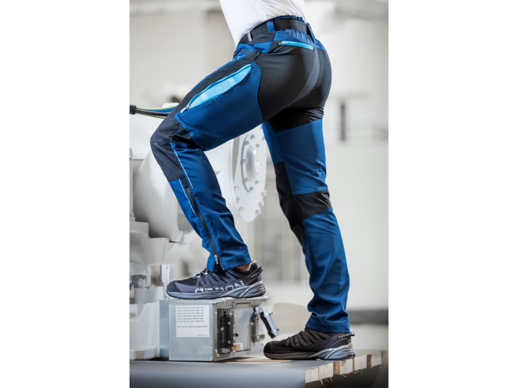 Montérkové kalhoty do pasu se strečovými vsadkami jsou navrženy pro maximální komfort a dlouhou životnost. Kombinace moderních materiálů zajišťuje vynikající pevnost, pružnost a odolnost i v náročných podmínkách. Kalhoty jsou vyrobeny ze speciální tkaniny se zesílenými panely Cordura® pro maximální ochranu namáhaných částí proti oděru. Anatomický 3D Silhouette COMFORT FIT střih umožňuje volnost pohybu, ergonomicky navržené linie zajišťují pohodlné nošení a boční ventilační zipy se síťovinou pomáhají s odvodem tepla. Elastický pas poskytuje pohodlné přizpůsobení obvodu pasu. Kalhoty jsou vybaveny rivety pro vyšší životnost a kovovým D-kroužkem pro uchycení předmětů. Prakticky řešené kapsy zahrnují 2 hluboké průhmatové kapsy, 2 zipové kapsy na mobil a drobnosti a dvě multifunkční zipové kapsy na zadní straně kalhot. Pro zvýšení bezpečnosti jsou kalhoty opatřeny dynamickými reflexními prvky, které zajišťují lepší viditelnost při práci ve zhoršených světelných podmínkách. Spodní lem nohavic je doplněn o zipy, které umožňují rozšíření obvodu nohavic pro snadné přetažení kalhot přes širší obuv a jsou opatřeny skrytými kovovými háčky, aby kalhoty perfektně držely na svém místě. Kalhoty jsou kompatibilní s přídavnými vyztuženými nářaďovými kapsami, které jsou určeny k nasazení na opasek pomocí suchých zipů. Sadu přídavných nářaďových kapes, která doplňuje kolekci, je možné objednat samostatně pod objednávkovým číslem H6260.